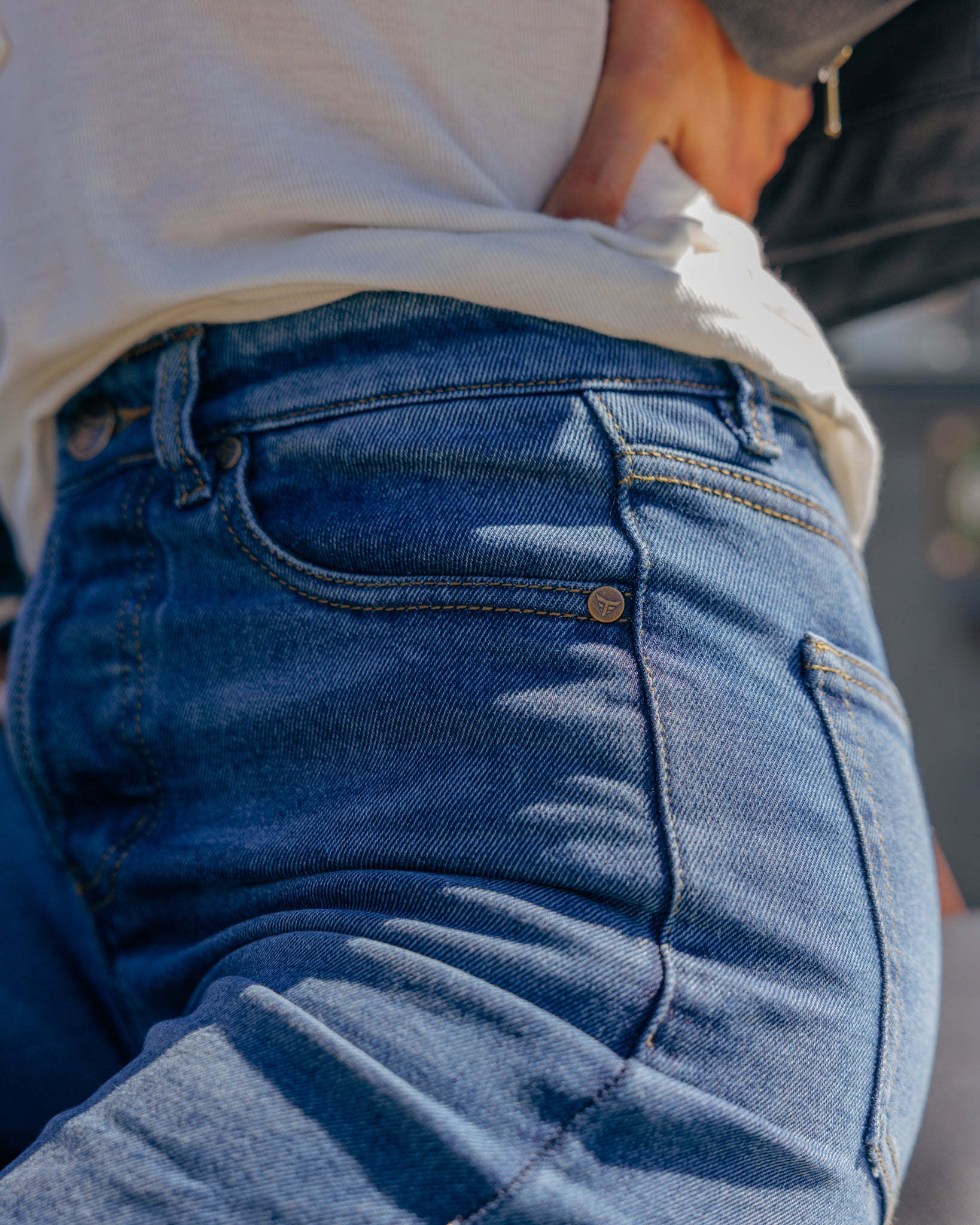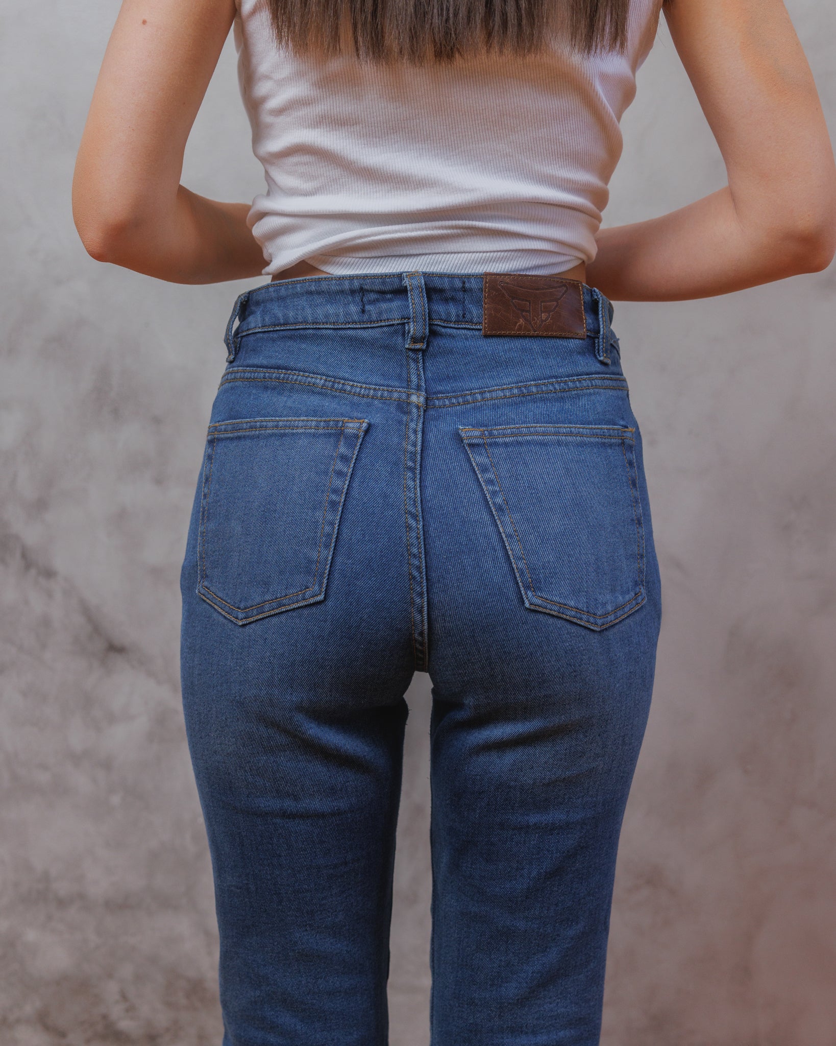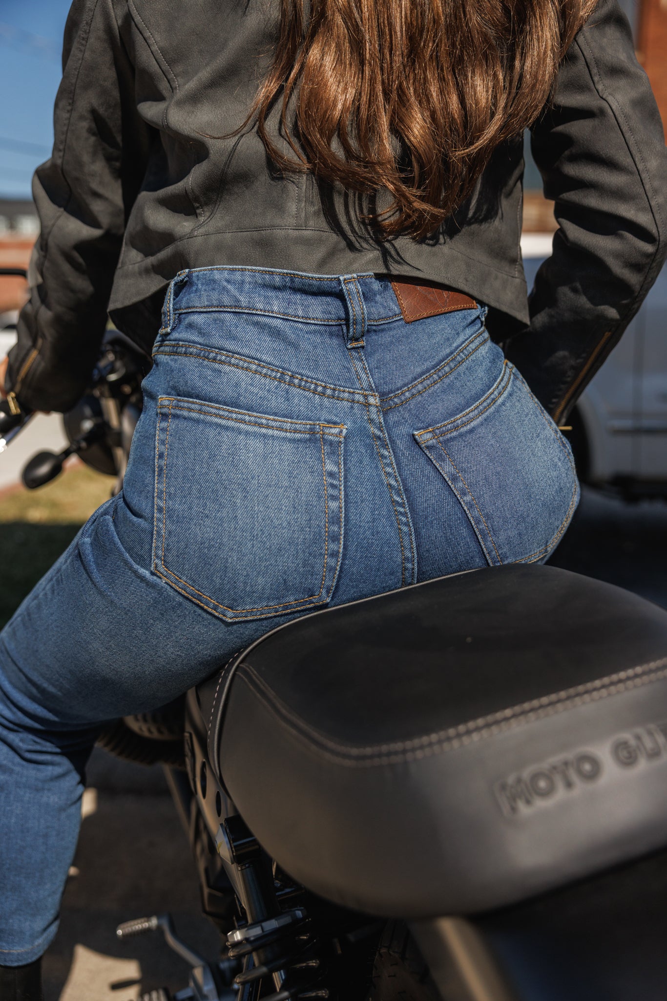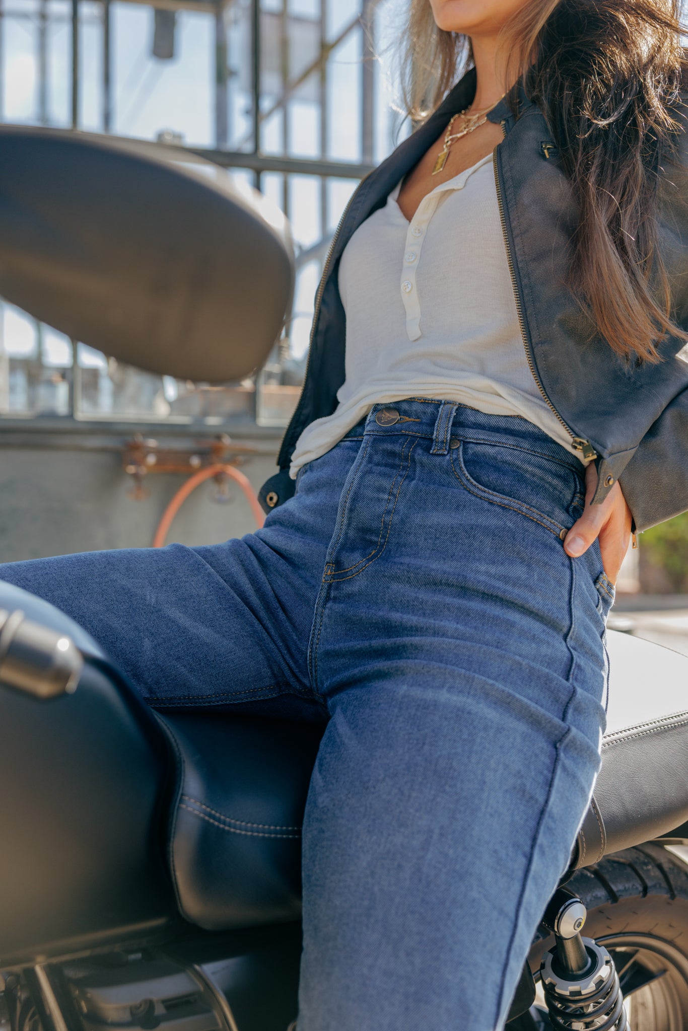 The Francesca Moto Jeans are the ultimate staple piece for your wardrobe. Designed from patented Aramith fabric, the classic high waisted, straight legged blue jean is durably made. With a slightly cropped fit, it works perfectly with your riding boots or sneakers.